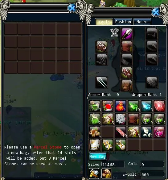 Из сумки новичка получаем расширитель инвентаря в виде маленького серого мешочка. Активируем его - большой инвентарь:
