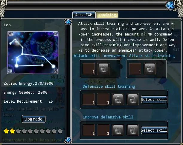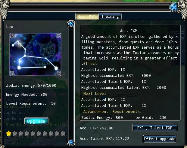 Открываем панель зодиака кликом по значку звездочки в нижней панели. Если достаточно энергии апгрейдим зодиак до 2го уровня: