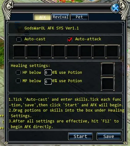 Для активации настроенной автоатаки нужно нажать "Start" в панели настройки автоатаки или горячую клавишу F12.