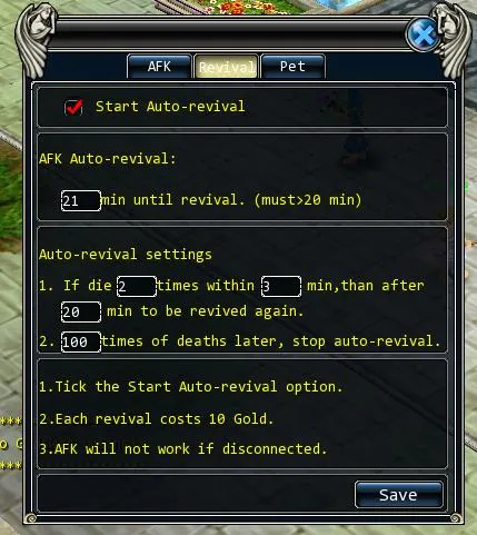 В окне устанавливается время автовоскрешения в минутах (любое, больше 20 минут). Так же устанавливается количество автовоскрений и лимит смертей после которого автовоскрешение будет остановлено. В случае отсутсвия золота в инвентаре персонажа автовоскрешение будет прервано.