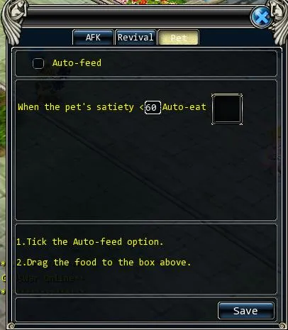 В третьем окне панели автоатаки можно включить функцию автокормления питомца. Функция включается установкой галочки, ниже устанавливается уровень сытости питомца после которого будет происходить кормление, в поле переноситься еда из инвентаря по аналогии с бутылками лечения\восстановления маны.