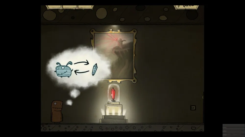 Подбираем малозаметную веревку. Жмем кнопку, толкаем камень. Привязываем веревку к двери и к камню. Проход открыт.