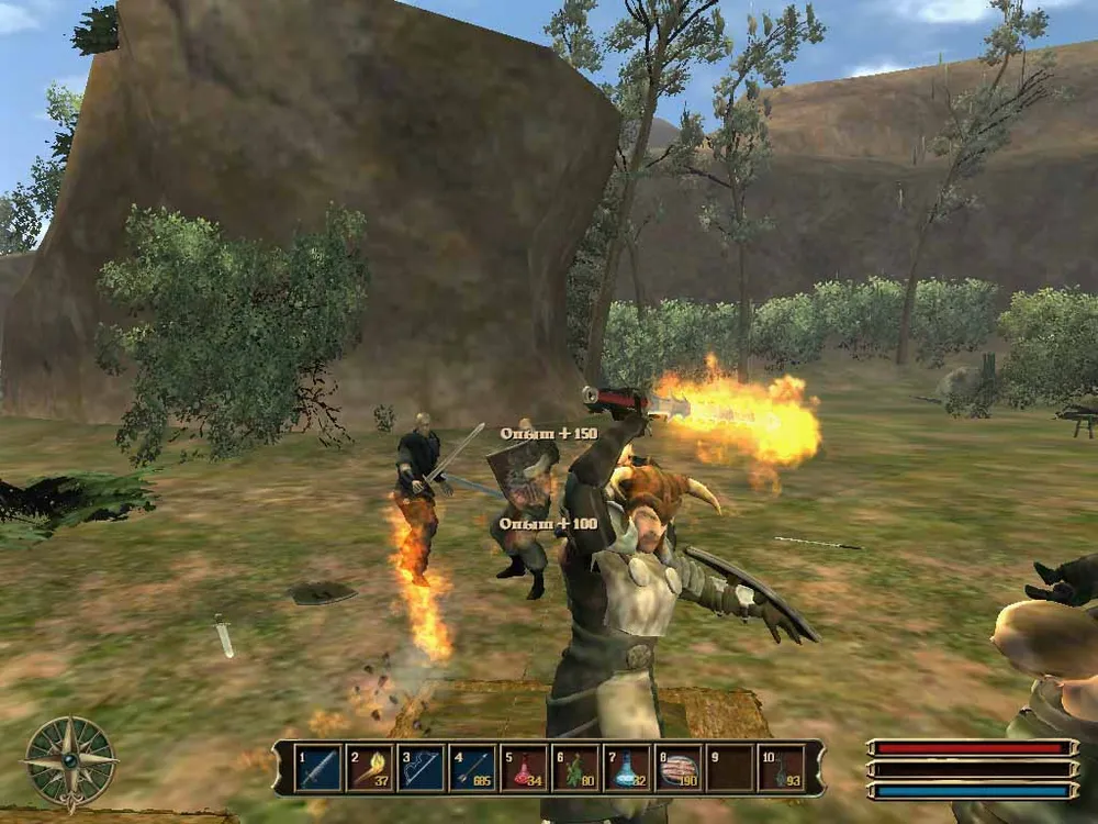 Упоение от схваток на мечах и топорах в "Готике 2" помнят все? Наверняка. Влево, вправо, размашистые "показные" удары или мощные рассекающие сверху вниз, отскоки, блоки, парирование: все это динамично, красиво и реализовано в беспрецедентной для 2004 года графике. Все захватывает.