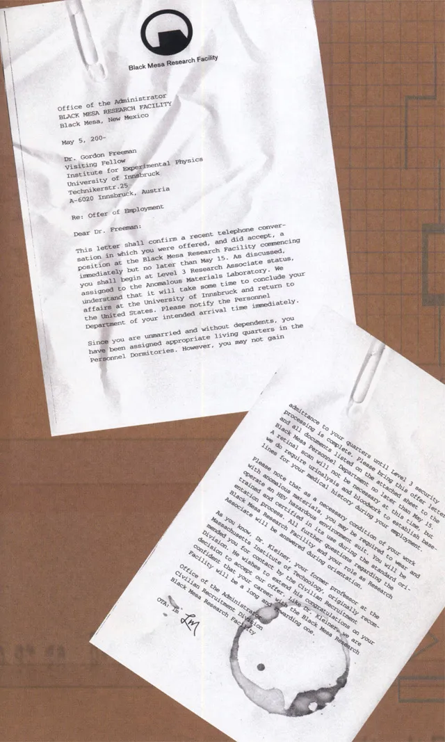 Фримен получил должность научного сотрудника в лаборатории аномальных материалов с уровнем доступа 3. Для проживания учёному была предоставлена квартира в общежитии исследовательского центра. Прежде чем герой приступил к своим обязанностям, он проходит курс подготовки к использованию специального защитного костюма H.E.V, от которого он был в восторге.