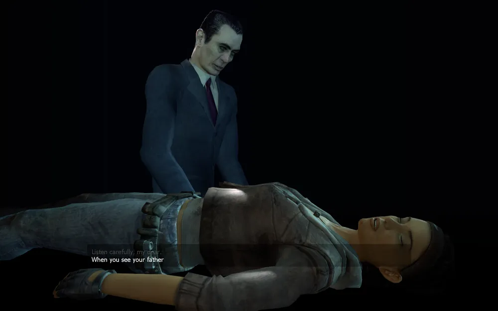 Далее он задабривает Фримана россказнями о том, как он спас Аликс и его жизнь. Хотя это не совсем и так. Слова "plucked - вытащил Аликс" и "Extract - вернуть (должок)" звучат как "Я играю вами в шахматы". Т.е. спасение Аликс было не более чем "на всякий случай" для него. А "вернуть" должок подразумевает, что они с Гордоном - не товарищи.