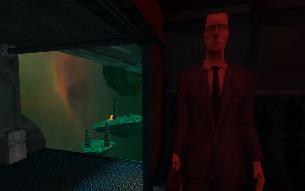 В сцене, где Шепард оказывается в зале, постепенно наполняющемся кислотой, G-Man появляется в окне комнаты управления наверху: он открывает Шепарду дверь наружу, спасая ему жизнь