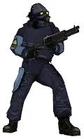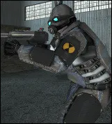 Экипировка - черно-зелёная униформа, кожаные сапоги, легкий бронежилет, шлем-респиратор с противогазом, приборами ночного и теплого видения и устройством связи. На поясе расположен счетчик Гейгера, система контроля жизнедеятельности и радиопередатчик.