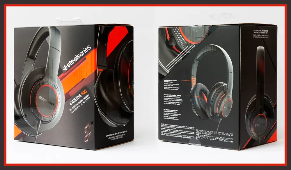 Лично мне на обзор попала базовая версия SteelSeries Siberia 100, и поэтому далее я буду описывать именно ее. Коробка, в которую помещается девайс, сделана из картона и оформлена в стандартном для устройств SteelSeries стиле – темно-серые тона, разбавленные ярко-оранжевой полосой, белые буквы и изображения самой гарнитуры. Надписи, размещенные на гранях упаковки, сообщают о совместимых с соткой устройствах (ПК на базе Windows и Mac, консоли PlayStation, мобильные телефоны) и о ее наиболее значимых технических особенностях – эргономичная форма, классный звук, возможность отключить микрофон одним нажатием кнопки, повышенная ударопрочность (падение с приличной высоты без последствий) и комфортные амбушюры, в которых ушки не преют (мои ушки, правда, рапортуют о противоположном, но я же понимаю – маркетинг и все дела). Ну и как любая продукция от SteelSeries, данная конкретная модель тоже разрабатывалась с учетом пожеланий и рекомендаций ведущих киберспортивных команд мира – Fnatic, Evil Geniuses, Na'Vi, Tyloo.