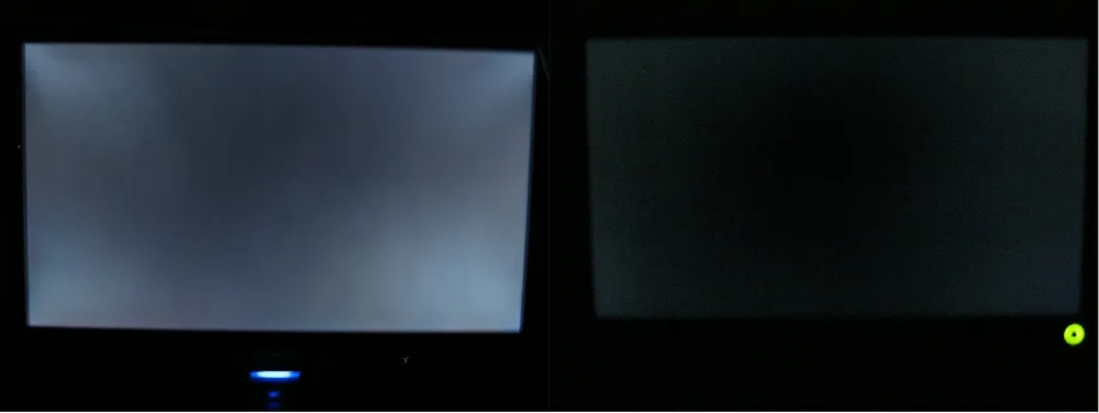 засветка. Яркость и контраст на 100%. Слева Samsung, справа BenQ. Следует обращать внимание на равномерность засветки, а не на яркость (камера специфично реагирует на 2333T).