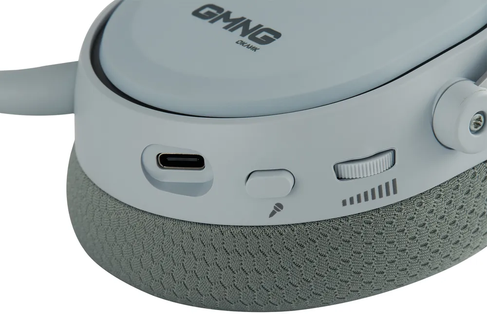 На задней стороне правой чашки находятся кнопки питания и переключения режимов. Примерно там же на левой чашке — кнопка отключения микрофона и колёсико регулировки громкости. И слева же гнездо USB Type-C для проводного подключения к компьютеру, планшету или смартфону.