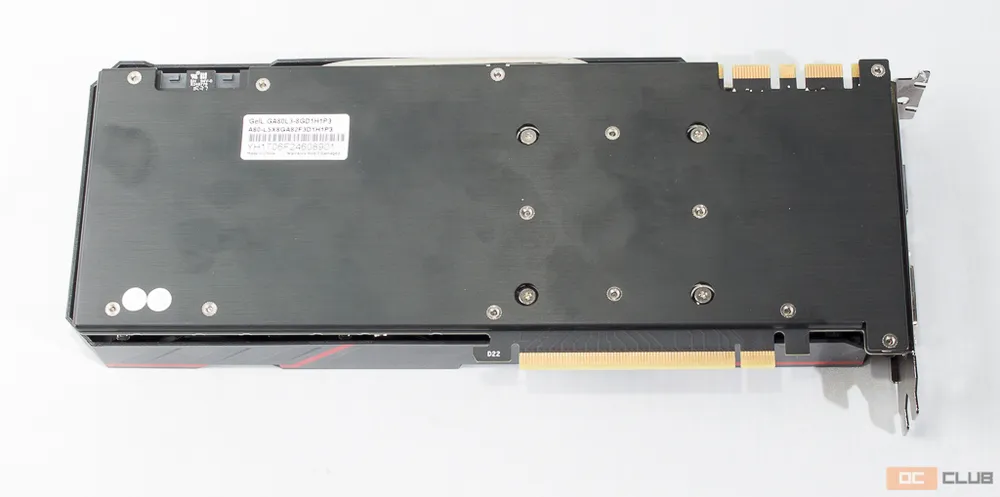 Продолжаем крутить видяху в руках, теперь посмотрим, что у неё сзади. А тут у нас практически ничего и нет. На обратной стороне присутствует усилительный бэкплейт чёрного цвета, выполняющий функцию защиты и придающий всей конструкции, что состоит из платы и СО, больше жёсткости. Сама пластина с особым аппетитом поглощает отпечатки пальцев, но опять-таки тем, кому внешний вид без разницы и это ни по чём. Также на пластине можно обнаружить наклейку с кодовым именем устройства и зашифрованными основными параметрами адаптера.