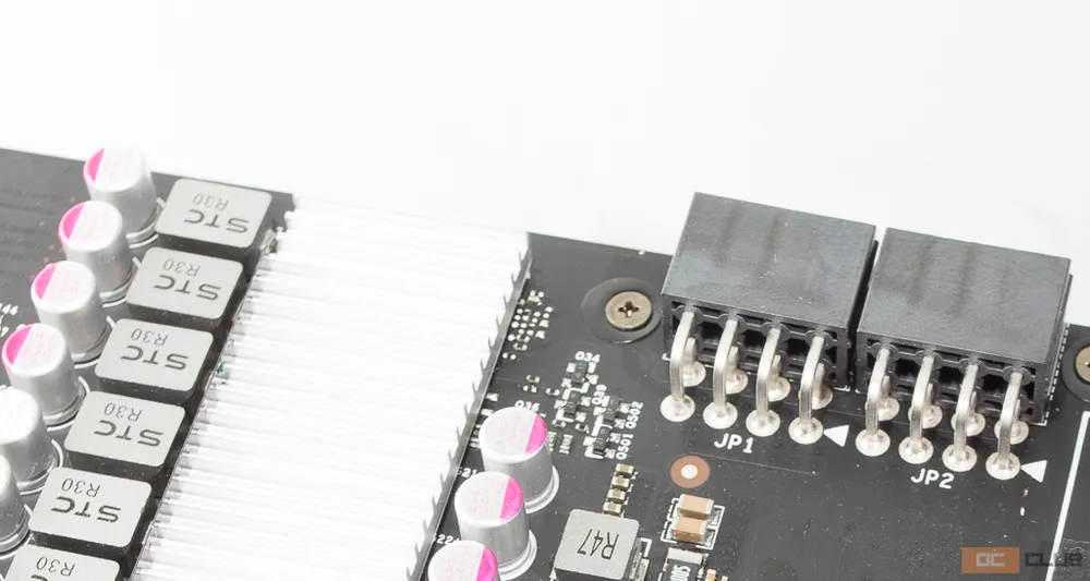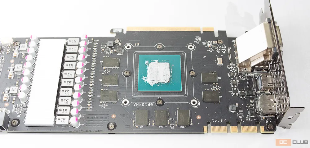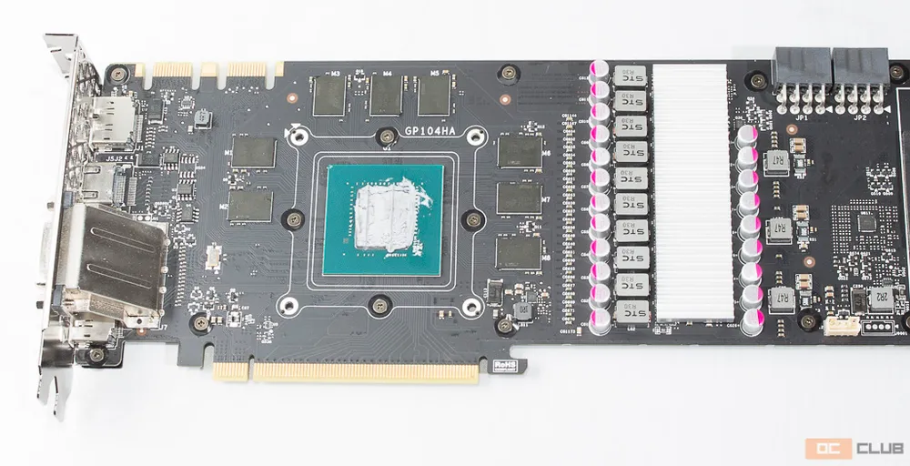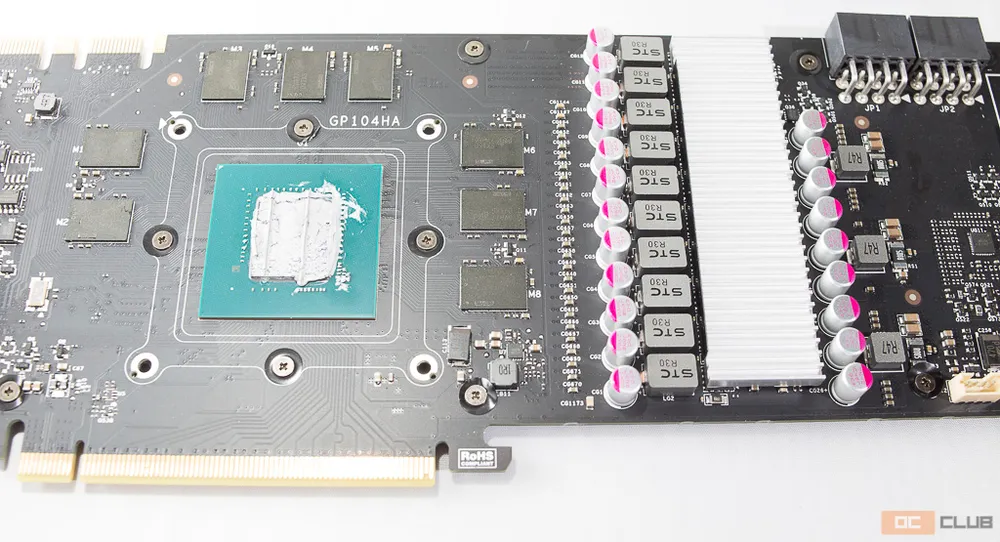За обеспечения дополнительного питания «сверху» PCI-E слота отвечают 2 дополнительных 8-контактных разъёма. Суммарно мощности при 2-ух дополнительных 8-pin не просто достаточно для 1080, но ещё и остаётся с немалым запасом, что даёт надежду на наличие разгонного потенциала.