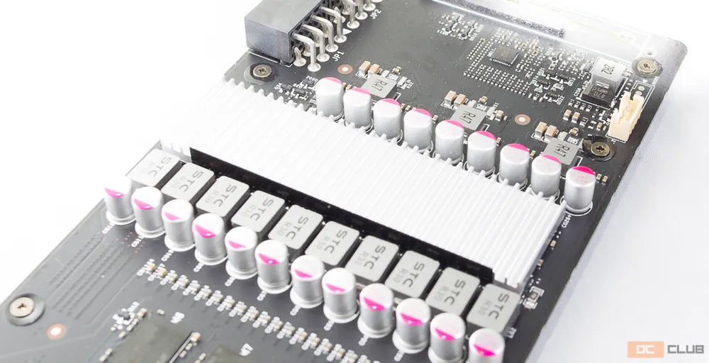 Не менее того радует глаз и система питания. За питание ядра отвечает 10 фаз, каждая из которых накрыта алюминиевым радиатором. Для памяти выделено ещё 3 фазы, а между ними расположен радиатор.