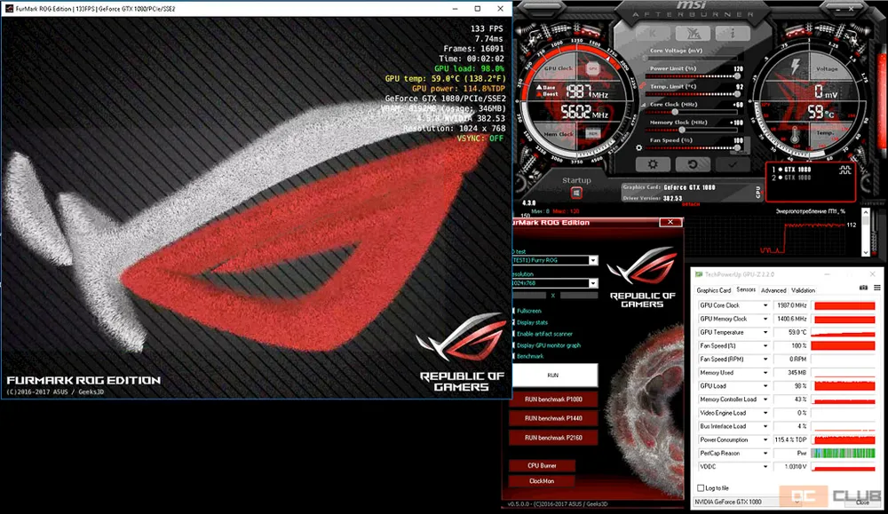 Результаты моих манипуляций меня одновременно и обрадовали, и огорчили. Проводились они при помощи нескольких утилит, а именно FurMark, который поможет пожарить на вашей видеокарте вкусную яичницу, MSI Afterburner, что позволит отрегулировать степень прожарки вашего блюда, а также GPU-Z, который покажет все параметры вашей «сковороды» в процессе приготовления.