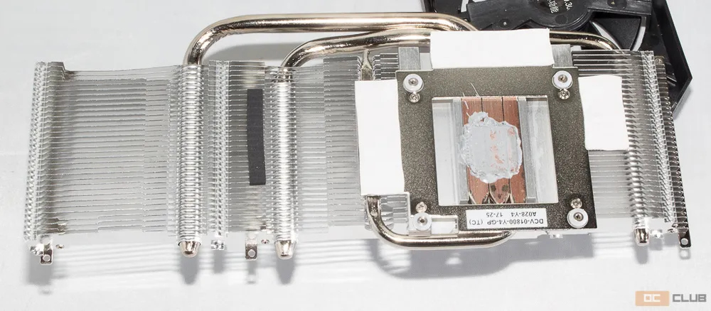 Следовательно, СО имеет все те же плюсы и минусы, что и у младшей модели графического адаптера. Из положительных моментов: есть 3 тепловых трубки, что полностью закрывают поверхность графического процессора, в тех же местах присутствуют термопрокладки, а именно на чипах памяти и узле VRM.