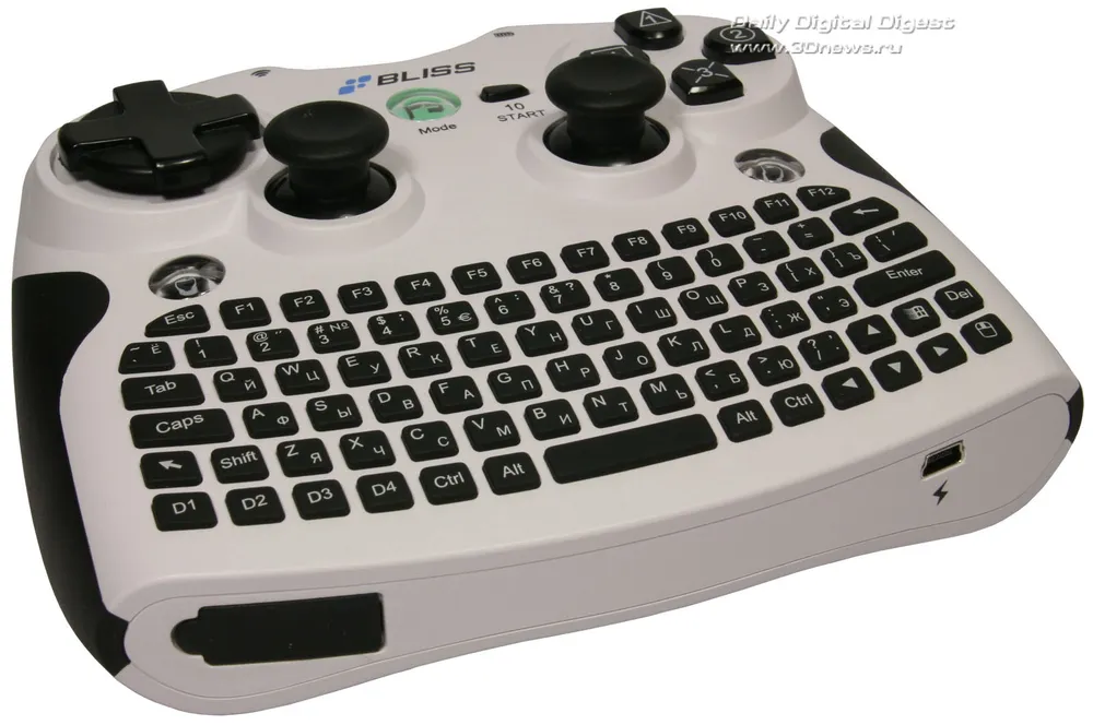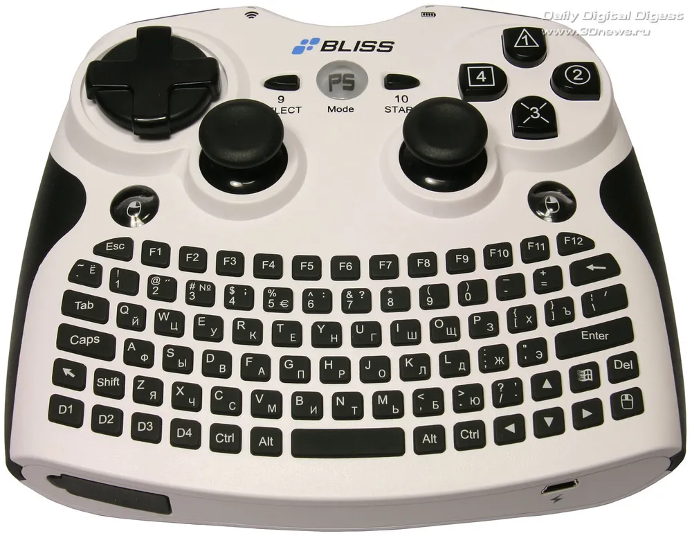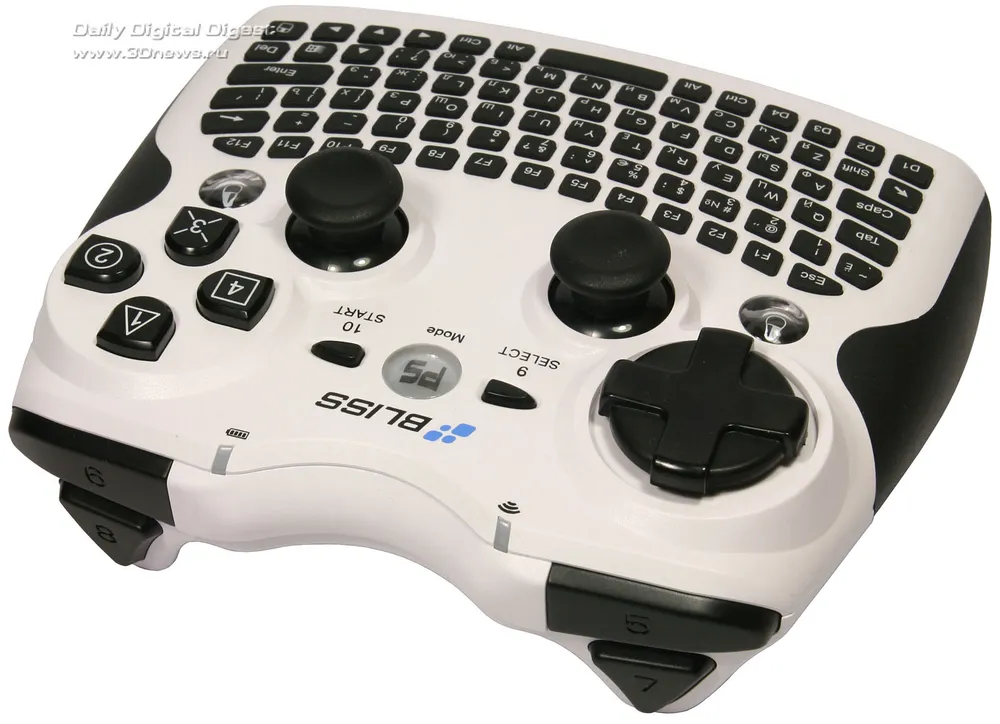 Несмотря на полный набор клавиш, пользоваться клавиатурой контроллера Bliss Air Keyboard Conqueror не очень удобно. И дело здесь даже не столько в недостаточной чёткости нажатия, сколько в небольшом размере кнопок, заставляющем запястья излишне напрягаться при работе. Для коротких сообщений, записок или пятнадцати минут в блоге этой клавиатуры достаточно, но не больше. А вот от использования новинки, в качестве игрового контроллера впечатлений гораздо больше. Сразу чувствуется, что основная её специализация — именно игры. Вначале были сомнения — не будет ли клавиатура мешать игровому процессу? Оказалось, что вовсе нет. Она расположена как раз в том месте, где у других контроллеров обычно пусто, так что эти сомнения развеиваются сразу, как только берёшь манипулятор в руки. Управление продумано досконально, а чёткая отдача кнопок и мягкий ход джойстиков позволяют расслабиться и действительно забыть об окружающей реальности. Ну а тот факт, что расположение кнопок и джойстиков игрового блока копирует классический контроллер для приставки Sony PS3, сочетая эргономичность контроллера X-BOX 360, делает только комплимент разработчикам, ведь это действительно один из самых удобных на сегодняшний день игровых манипуляторов. Но в отличие от большинства конкурентов, Bliss Air Keyboard Conqueror можно использовать и с Sony PS3, и с обычным ПК.