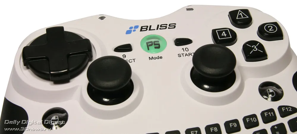 Все дополнительные кнопки манипулятора пронумерованы. Кроме уже упомянутой четвёрки, контроллер имеет ещё шесть программируемых кнопок, четыре из которых расположены в виде креста в правом верхнем углу, а оставшиеся две — в центральной части, по бокам от круглой клавиши с ярко-зелёной подсветкой [PS], переключающей режимы работы клавиатуры и игрового блока, а также активирующей режим работы с игровой приставкой Sony PS3. Также контроллер может похвастаться двумя пяти-позиционными мини-джойстиками и крестовиной управления. Два основных высоких джойстика отличаются длинным очень плавным ходом и чётким вращением во всех направлениях. Ну и над клавиатурой, по углам, расположена ещё пара клавиш, но их функции уже не игровые, а чисто бытовые. Эти клавиши имитируют работу левой и правой кнопок мыши.