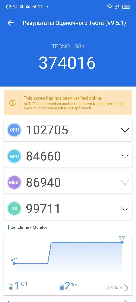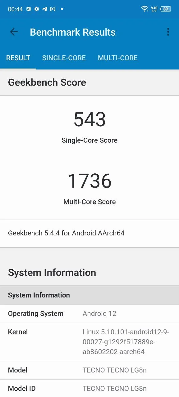 Тесты в бенчмарке AnTutu дают хороший результат – 374 000 баллов. В тесте Geekbench смартфон набрал 543 балла за одноядерную производительность и 1736 за многоядерную.