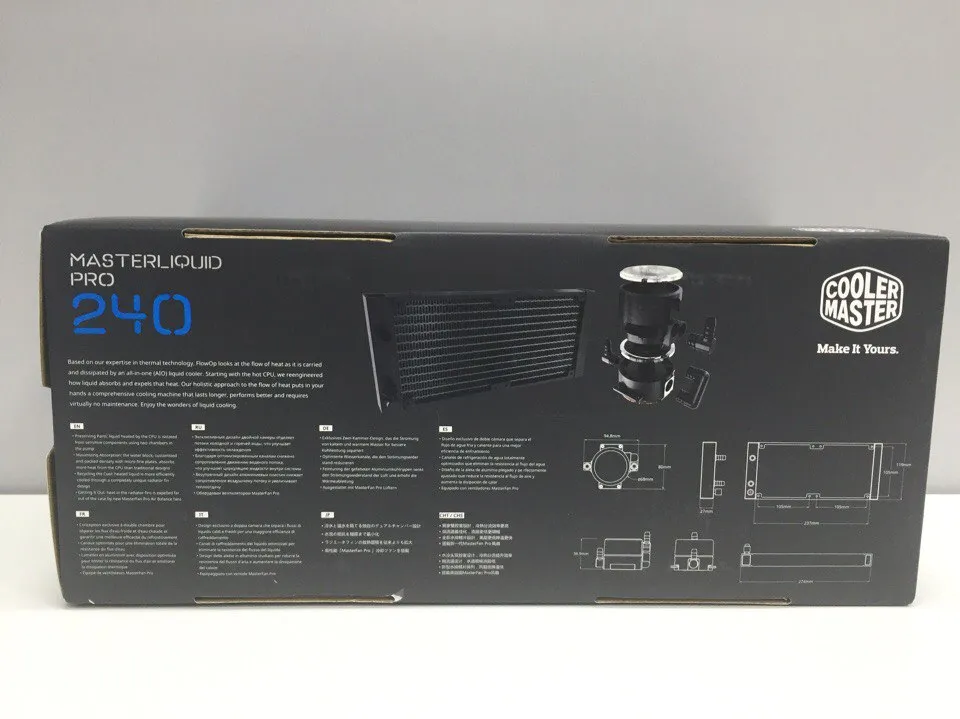 В черной-черной коробке, лежит черная-черная CBO MasterLiquid Pro 240. Выглядит ну прям очень! Отличный принт на коробке содержит все размеры комплектующих и полный перечень характеристик.