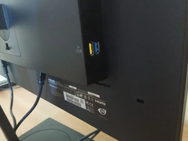 Подключается монитор через DisplayPort 1.2, HDMI 1.4 и даже через старенький DVI-D. Предусмотрен хаб на четыре USB-порта, причем два из них направлены, как и остальные интерфейсы, вниз, а еще два – влево, чтобы удобнее было вставлять флешки. Один из последних подходит для быстрой зарядки гаджетов.