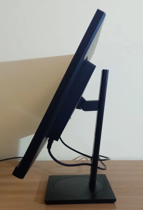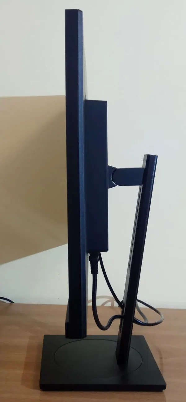 Подставка обладает всем возможным функционалом. Стальная ножка не содержит гнущихся элементов, позволяет регулировать положение экрана по высоте в диапазоне 15 см. Наклон по вертикали довольно велик: от -5 до 35 градусов – а по горизонтали так и вовсе все 360. То есть можете повернуть экран к человеку, что сидит напротив вас, и не придется при этом двигать подставку и все вещи на столе. Предусмотрен и поворот в портретный режим, что необходимо для верстки и дизайна.