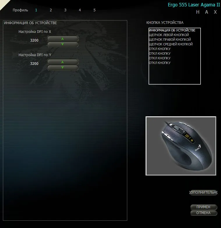 Итак, давайте все поэтапно. В главном окне нам предлагают настроить разрешение мыши и сохранить его в одну из пяти конфигураций. Более всего радует то, что разрешение можно настраивать прямо на мышке, без установки проги.