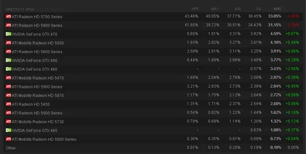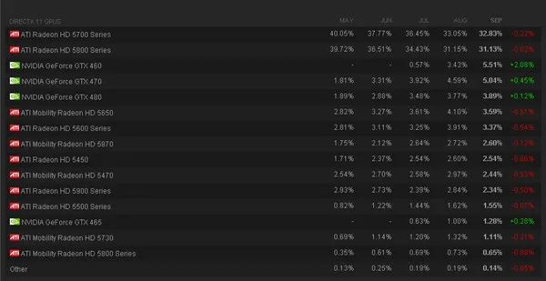 Согласно собранной за сентябрь 2010 года статистике сервиса Steam, DirectX 11-решения от NVIDIA начинают медленно, но верно отбирать рынок у конкурентов из AMD.