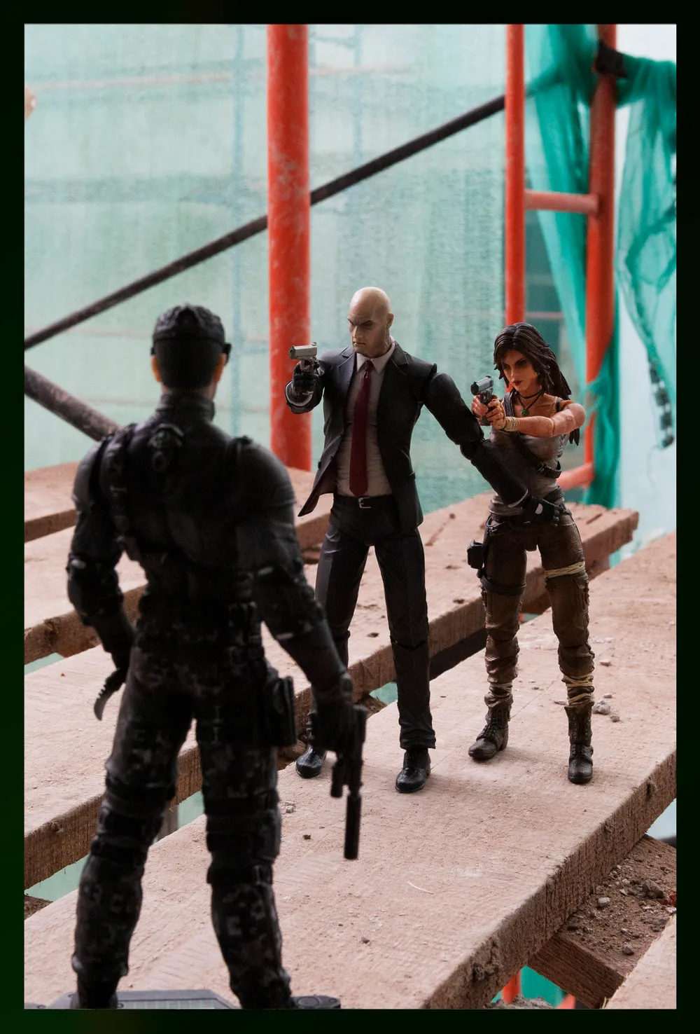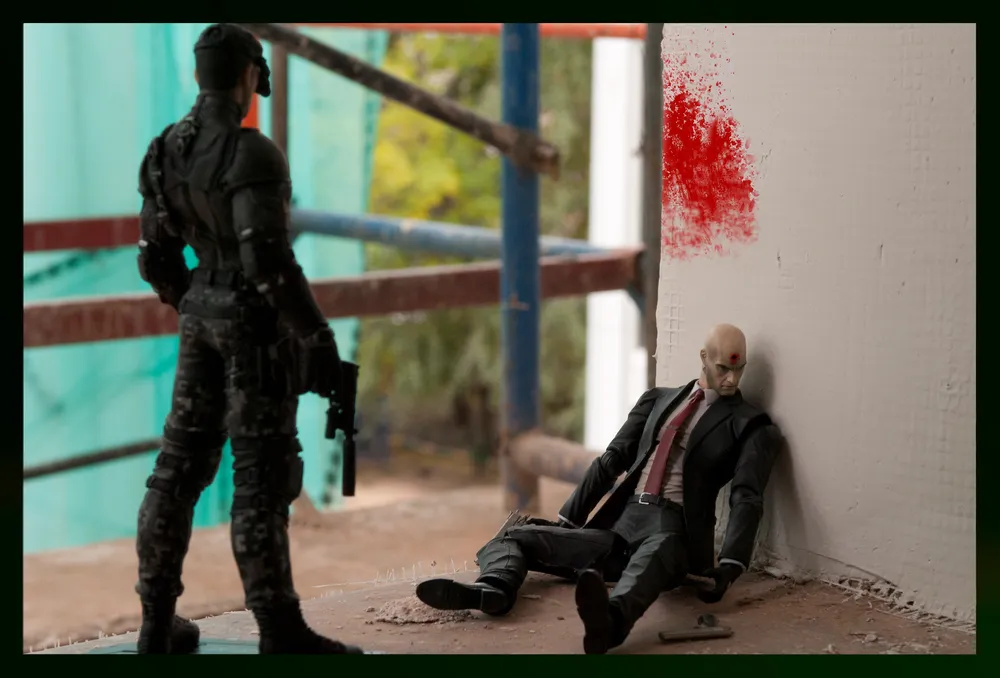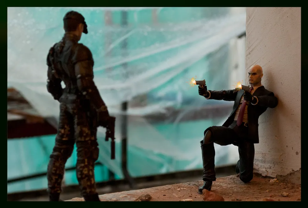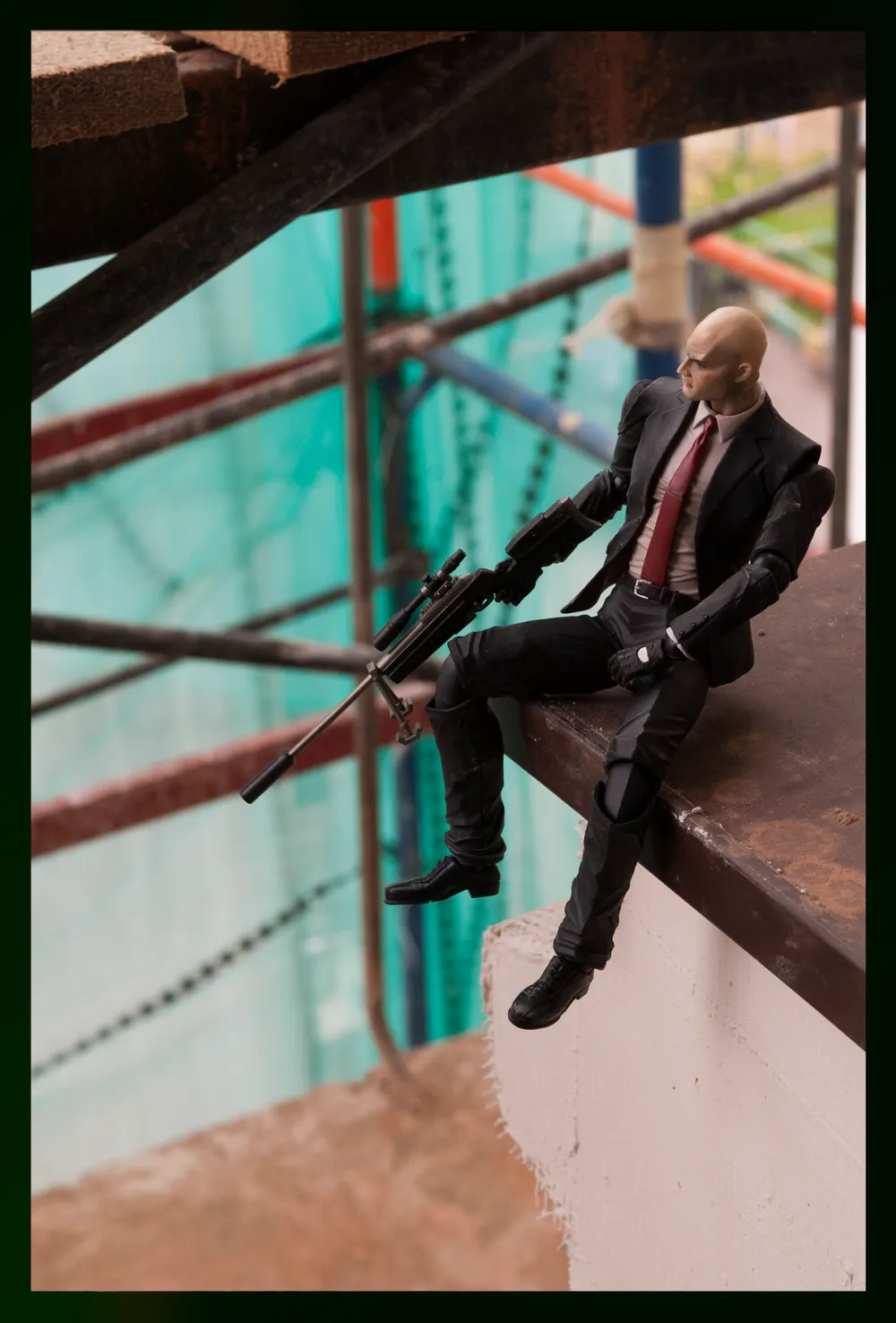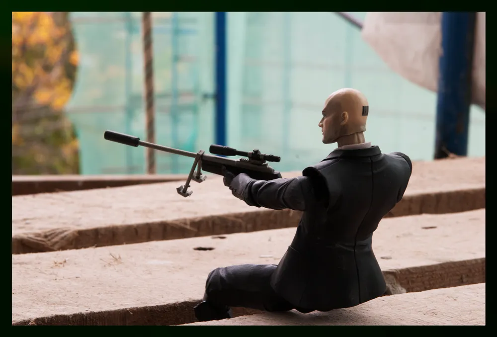 Но вот корячания и мучения, сопровождаемые известными словами, закончены. Упаковку можно отбросить в сторону и заняться уже непосредственно пристальным разглядываем ее содержимого. Начнем с фигурки. Первое впечатление - шарниры ходят очень легко. Возникает ощущение, что фигурка вся такая гуттаперчевая, гибкая. Достаточно легкого нажатия, чтобы шарнирчики в суставах и торсе пришли в движение и изменили положение рук, ног, туловища. Невольно закрадывается сомнение: сможет ли Хитмен стоять сам, не будут ли его руки опускаться под тяжестью оружия, а ноги - самопроизвольно подкашиваться? На самом деле, опасения напрасны. 47-й вполне нормально стоит без поддержки, положение и угол сгиба рук в суставах адекватно фиксируются и "не плывут".