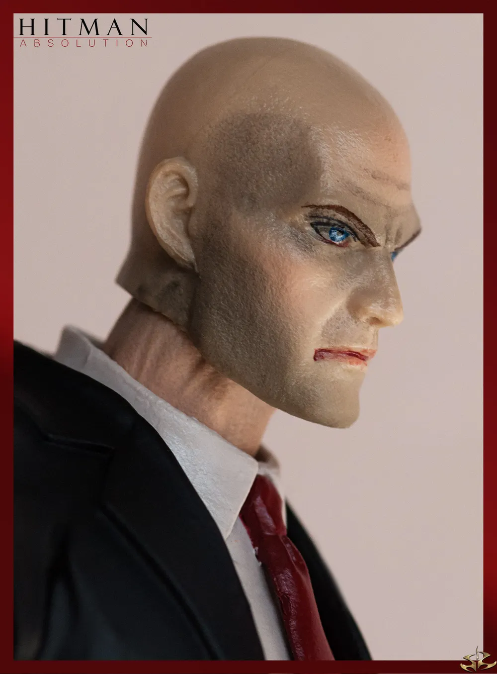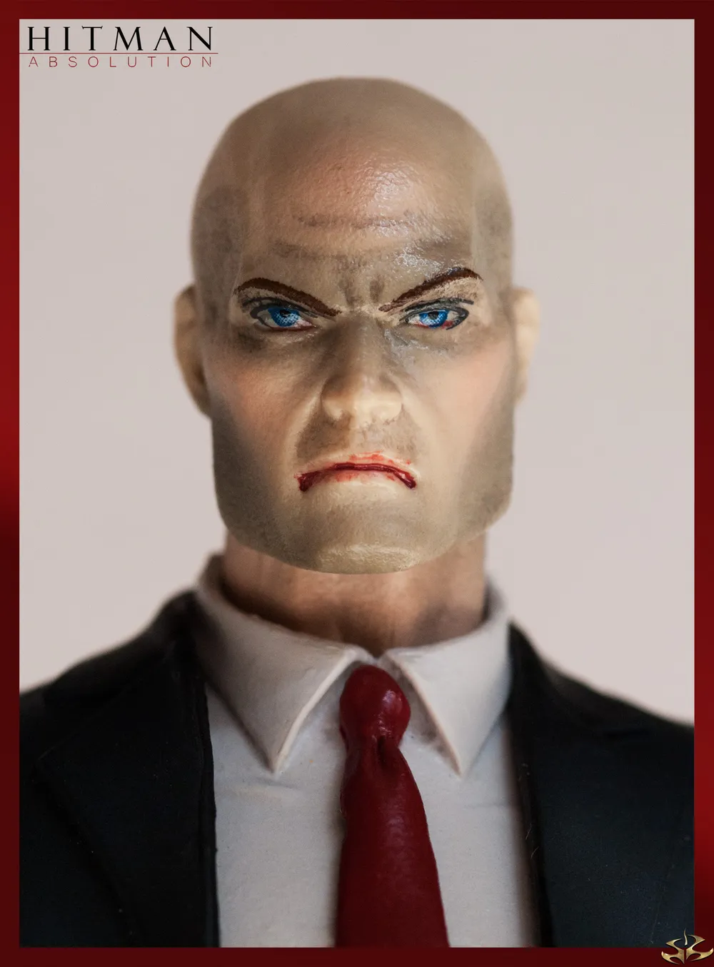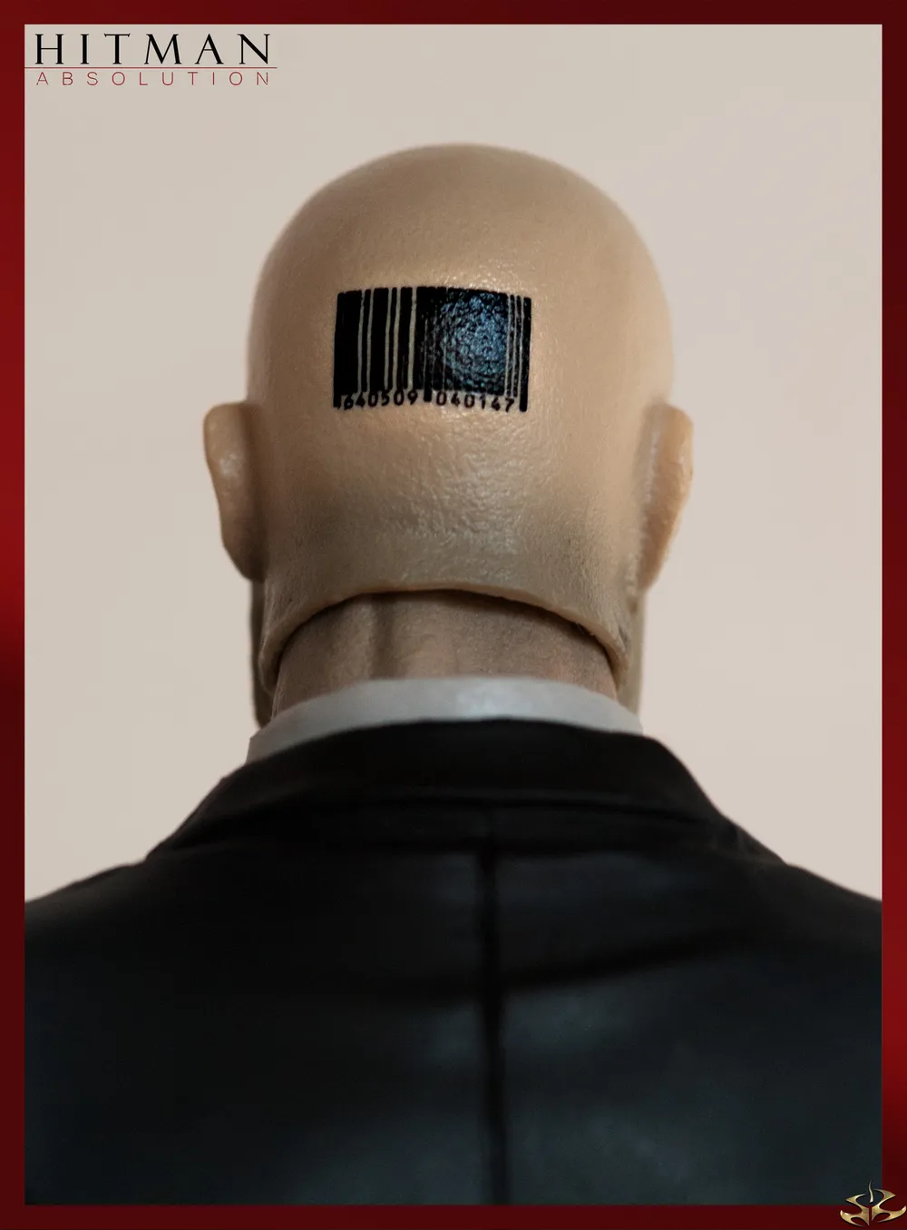 Рассмотрим знаменитого киллера поближе. Нет слов, суровый мужик. Черты лица фигурки вышли жестче, чем у игрового прототипа, лицо - худощавее. И глаза немного не того цвета. Вы когда-нибудь обращали внимание, что у Агента в игре очень красивые серо-голубые глаза? В них есть даже что-то теплое. У фигурки глаза небесно-голубые, холодные, взгляд колючий. Некоторая небрежность в окраске элементов лица лишь подчеркивает брутальность персонажа. Да и заметна эта небрежность становится, если только рассматривать лицо Хитмена сквозь увеличительное стекло, а без оного неровности окрашивания не видны. Взгляд за них совершенно не цепляется. Затылок каноничен - со штрихкодом. Хотите большего соответствия игре? Можете заклеить его пластырем.