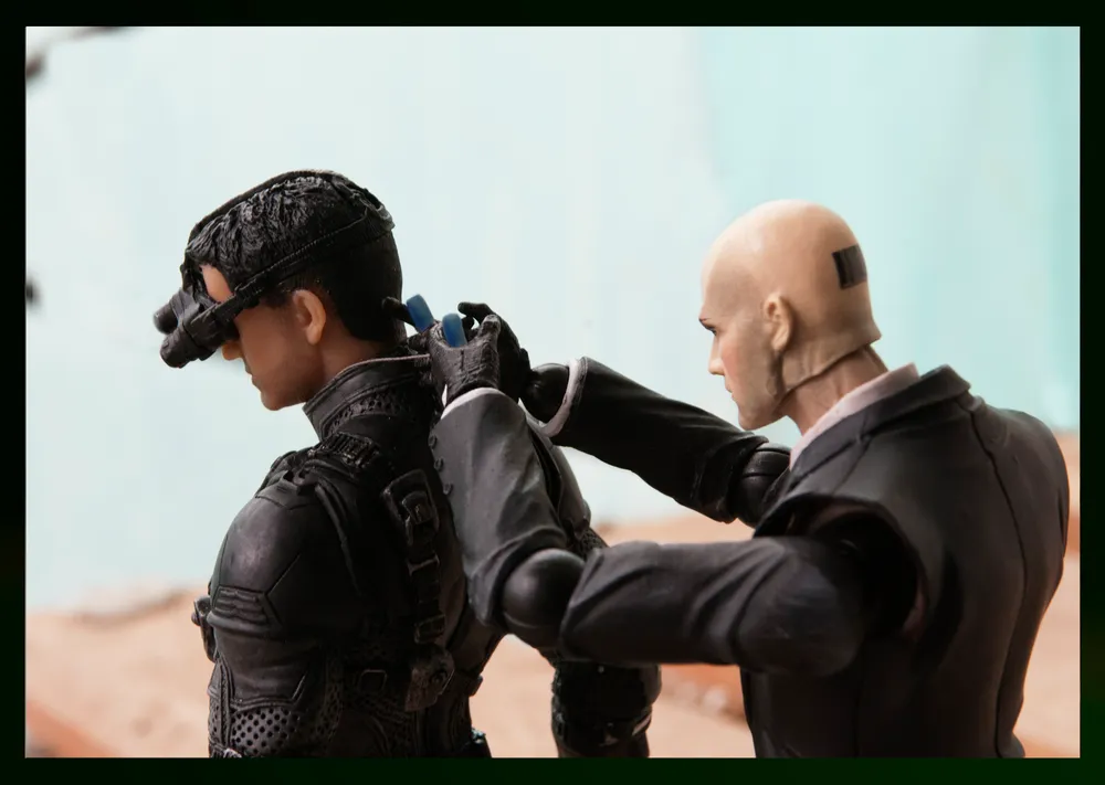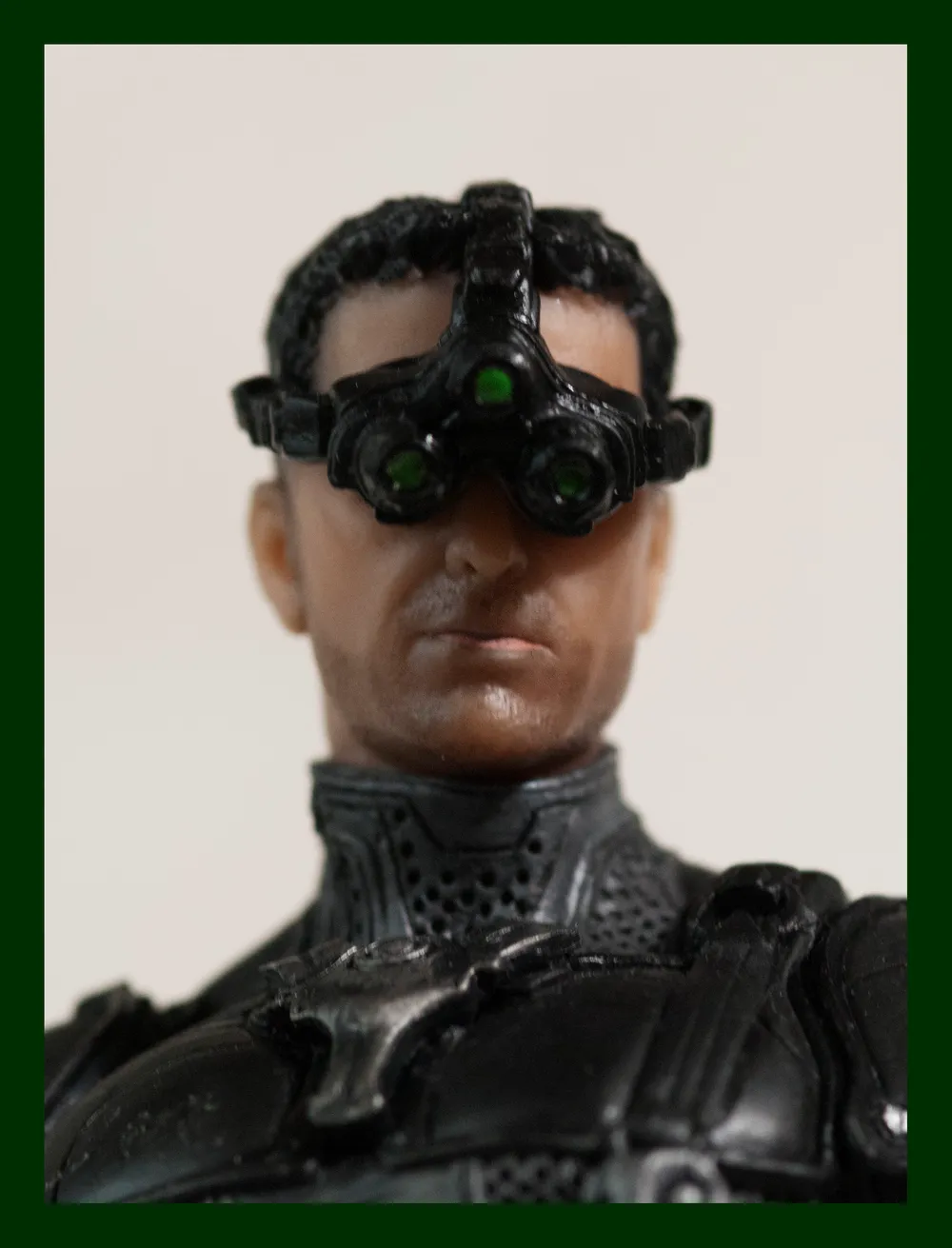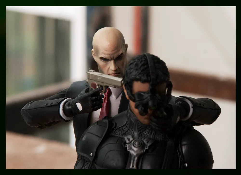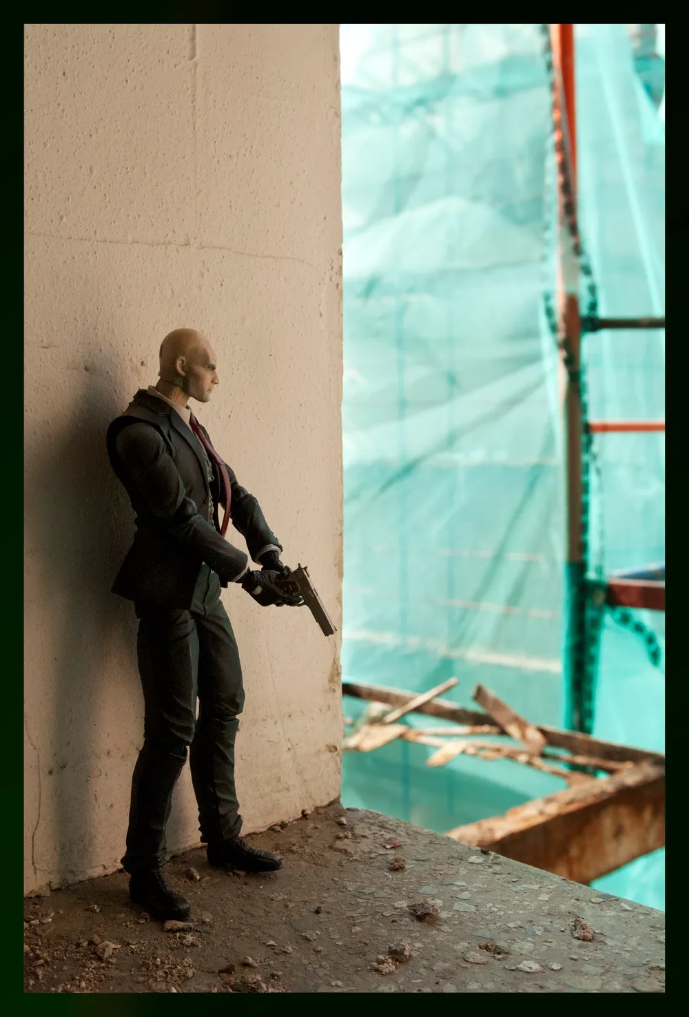 Рассмотрим знаменитого киллера поближе. Нет слов, суровый мужик. Черты лица фигурки вышли жестче, чем у игрового прототипа, лицо - худощавее. И глаза немного не того цвета. Вы когда-нибудь обращали внимание, что у Агента в игре очень красивые серо-голубые глаза? В них есть даже что-то теплое. У фигурки глаза небесно-голубые, холодные, взгляд колючий. Некоторая небрежность в окраске элементов лица лишь подчеркивает брутальность персонажа. Да и заметна эта небрежность становится, если только рассматривать лицо Хитмена сквозь увеличительное стекло, а без оного неровности окрашивания не видны. Взгляд за них совершенно не цепляется. Затылок каноничен - со штрихкодом. Хотите большего соответствия игре? Можете заклеить его пластырем.