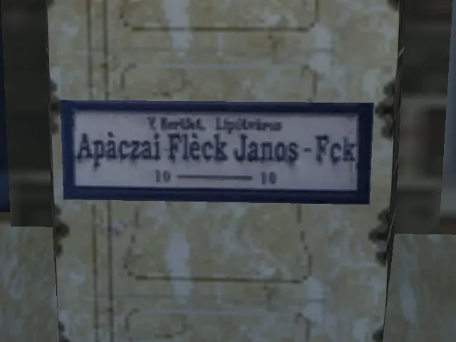 Суть: на стене у входа в отель весит табличка с надписью "Apaczai Fleck Janos - Fck". Janos может как то намекать на одного из сотрудников IOI - Яноса Флоссера (Jans Flosser), а Fck - на датский футбольный клуб.