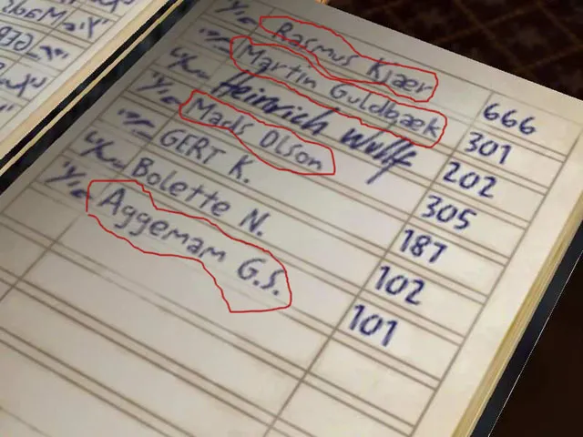 Суть: в списаках гостей очередное упоминание о группе Aggemam, имена разработчиков (Раймус Кайер, Мартин Гулдабек, Медс Олсон) и гостиничный номер "666".