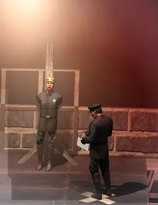 Сначала мы переодеваемся в одежду рабочего и ждем окончания 1-го акта. В данный момент актеры репетируют сцену казни. "Наш итальянский друг" вместе с солдатом стоят не сцене, оба долго поют, потом актер стреляет из пистолета и Альваро делает вид, будто умирает.