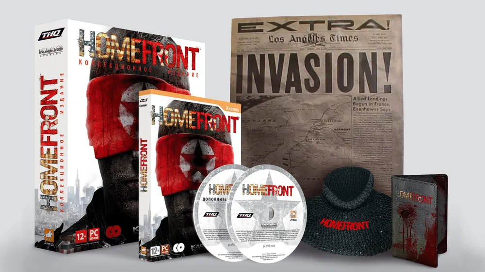 В коллекционное издание Ноmefront входят диск с игрой, диск с дополнительными материалами, стильная обложка на паспорт, выполненная из кожи, руководство пользователя, дополнительный контент (эксклюзивный вид оружия), а также военный шарф!