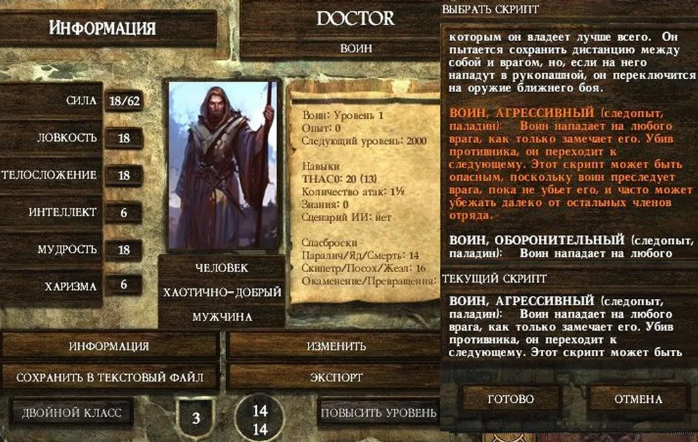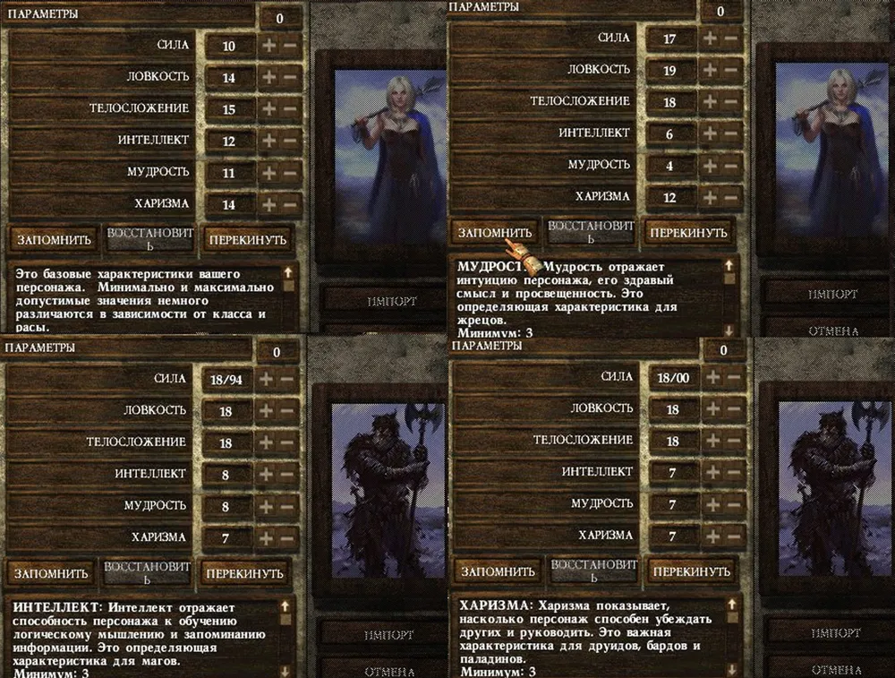 Вот мы и подобрались едва ли не к самому важному: к созданию характеристик. Никаких повышений ловкости, силы и прочего в процессе игры не будет, всё нужно создавать сразу и сейчас. Увы - генератор случайных чисел так и норовит подсунуть меньшую сумму очков; ура – их можно менять сколь угодно долго. Хотите создать супергероя? Ни одно из предложенных системой шести чисел не должно быть ниже или равно двенадцати. Кстати, ещё одно преимущество дуал-класса: воинский бонус к силе. Идеальный вариант силы: 18.00. Почему? Если вашему герою с силой 18.60 попадётся предмет экипировки с бонусом к этой характеристике, то его сила станет 18.80. При силе 18.00 предмет сразу повысит её до 19 – ого!