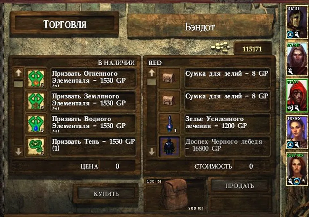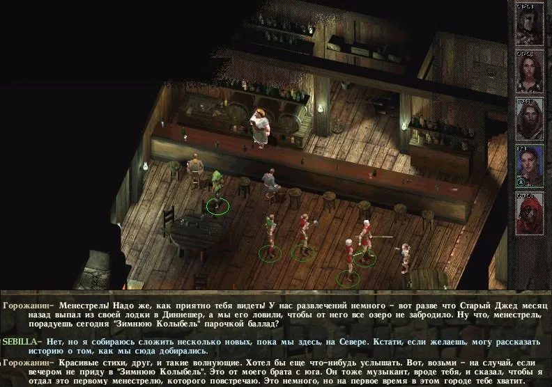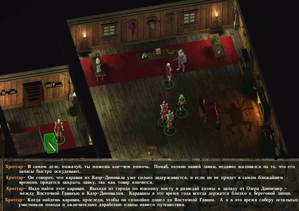 В нашем случае группа, отдыхающая в таверне, состоит из паладина (человек), барда-полуэльфа и трёх воинов (после третьего уровня будут дуал-классированы). Получаем предложение принять участие в походе: следовательно, нужна экипировка; шестами много не навоюешь. Начинаем с самого простого: бард поёт песенки,