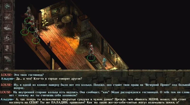 Гоблины являются не препятствием, а поставщиками товаров для продажи. С огром в башне можно поговорить: друид Кулдахара подскажет, как ему помочь. Прежде всего ищем место для отдыха; попутно получая опыт за обнаружение мошенника. (И как это паладин не потеряла свой статус?! Впрочем, хорошо, что не потеряла.)