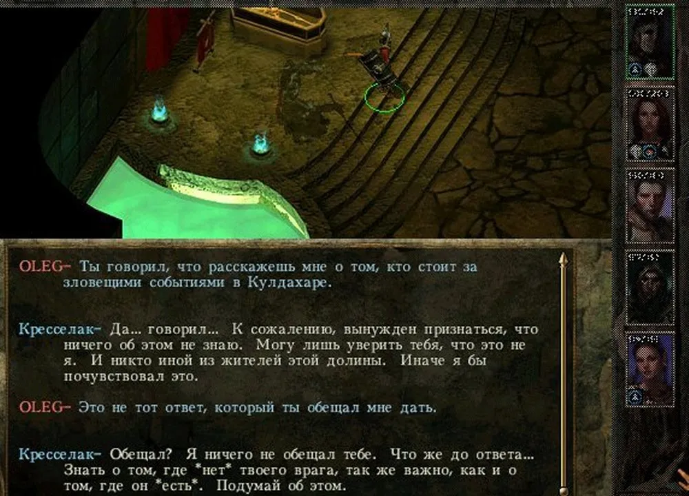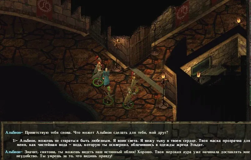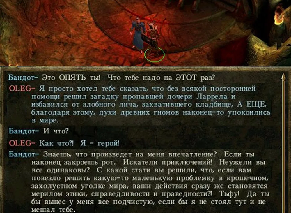 Перед вами два скриншота, с двумя вариантами перевода диалога: пиратский от «Фаргуса» и лицензионный от «Седьмого волка». Мне больше нравится первый. (Впрочем, озвучка вступительного ролика от пиратов не идёт ни в какое сравнение с лицензией: читал профессиональный артист.)