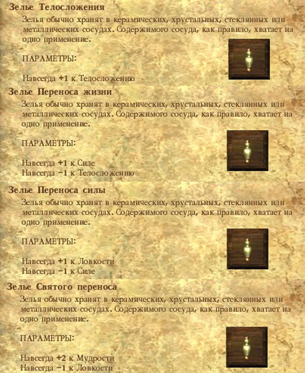 Правда, в схеме не хватает зелья интеллекта – очень может быть, что оно у кого - ни будь есть, надо только найти. Остаётся добавить, что зелья легко узнать по необычной форме бутылочки, зелёному цвету и неопознанности.
