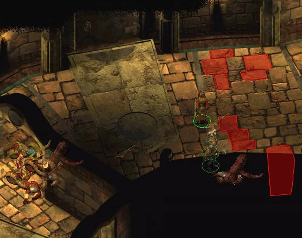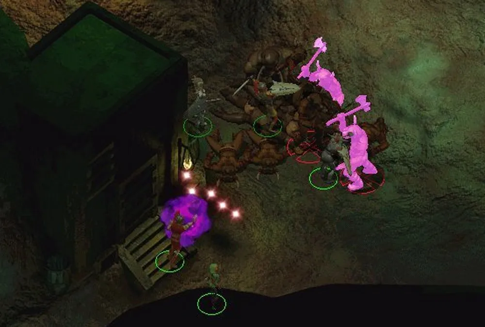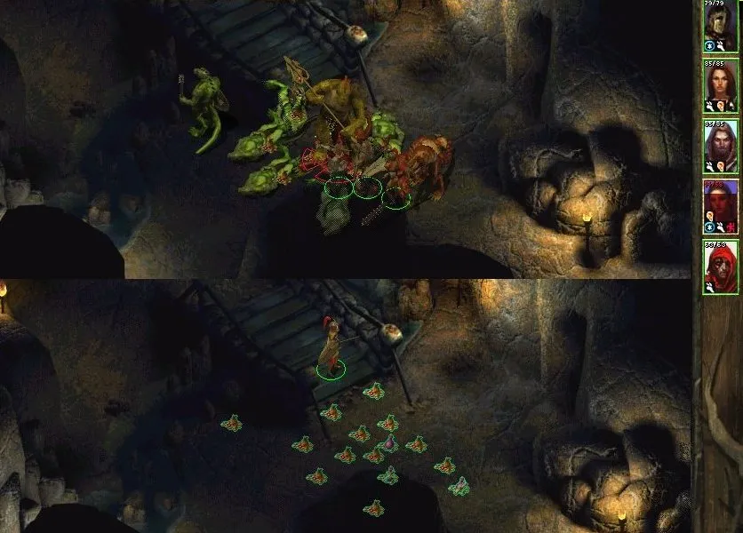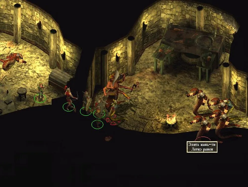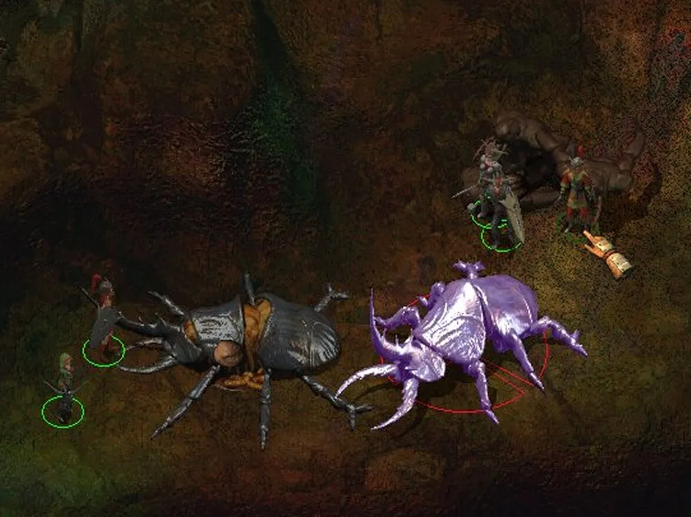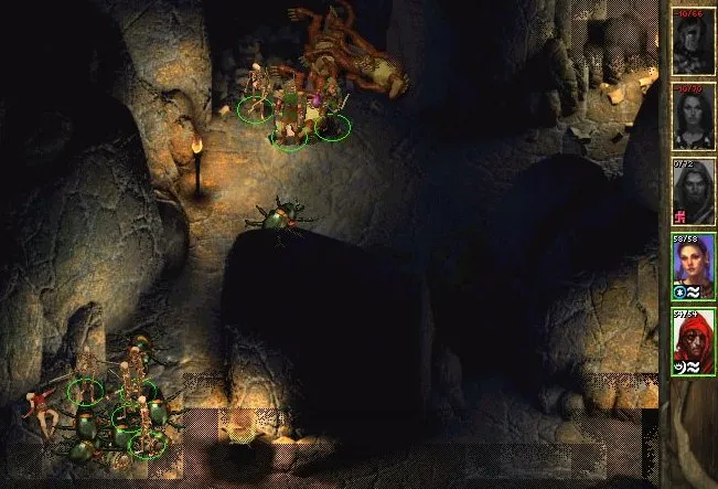 С зельями разобрались, заходим. И сразу начинаются проблемы… Ящеры обожают применять заклинание, от которого нет защиты: окаменение. Так что если лучники не успели завалить вражеского колдуна – ждите неприятностей. Ну ладно, справился с ящерами, пошёл направо от входа: жуки! Те самые, что сбежали из таверны! И тоже превращают героев в камень…