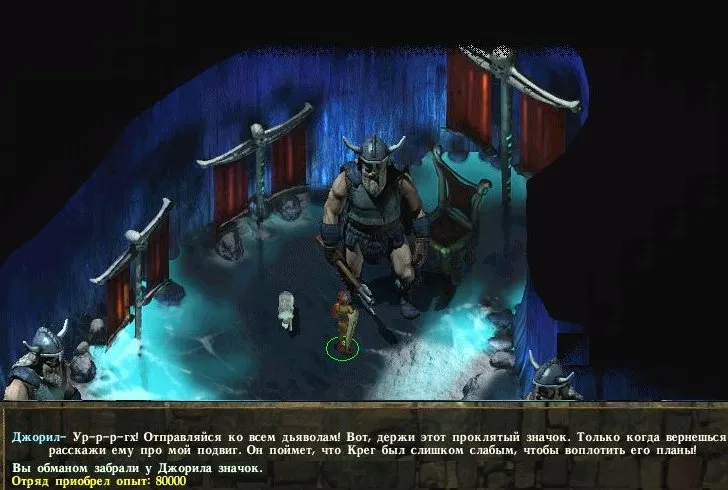 Так не пойдёт. Четверых – на верх карты, за узкий мостик; с коварной пусть разговаривает воин/вор Олаф. Леди хочет боя (убьёт любого за два-три удара!), но герой выпивает зелье невидимости и бежит к своим, минуя великанов.