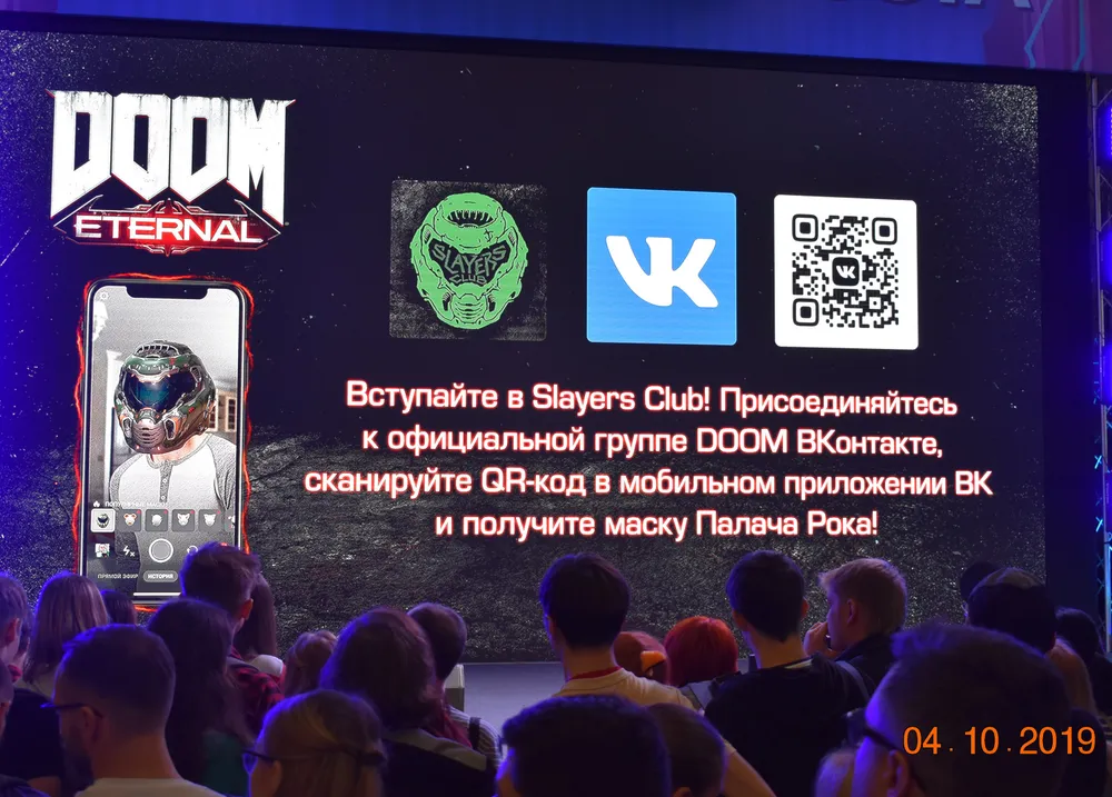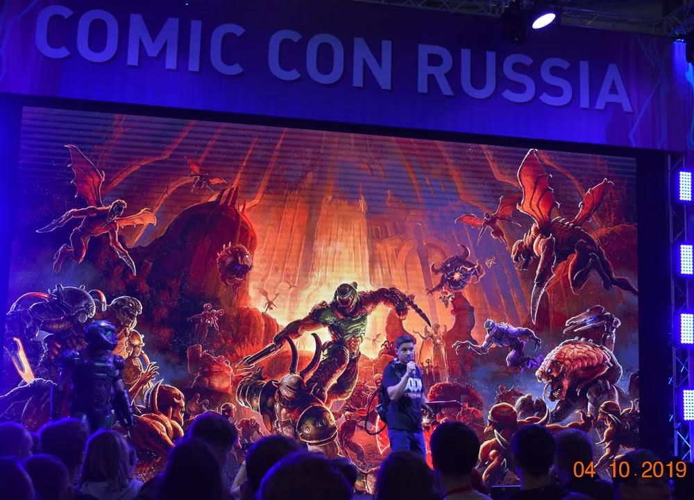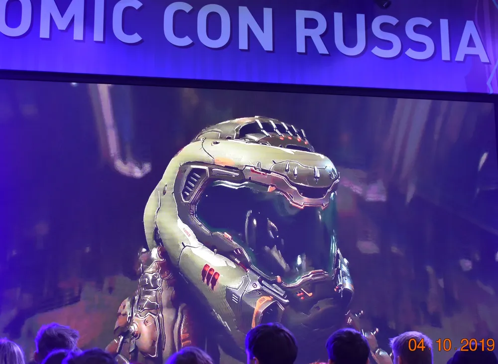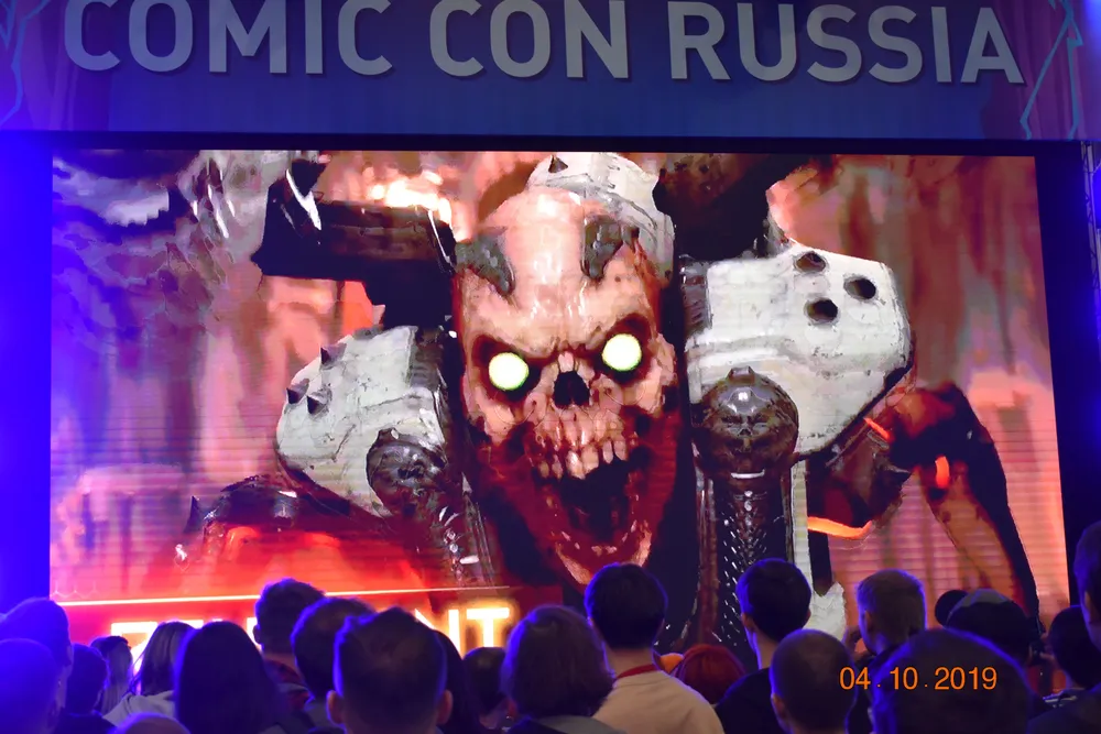 Демонстрация закончена, выходящим вручают сумки (фото – позже), и я опрометью бегу в зал Comic-Con – на большом экране уже началась презентация «Doom Eternal».