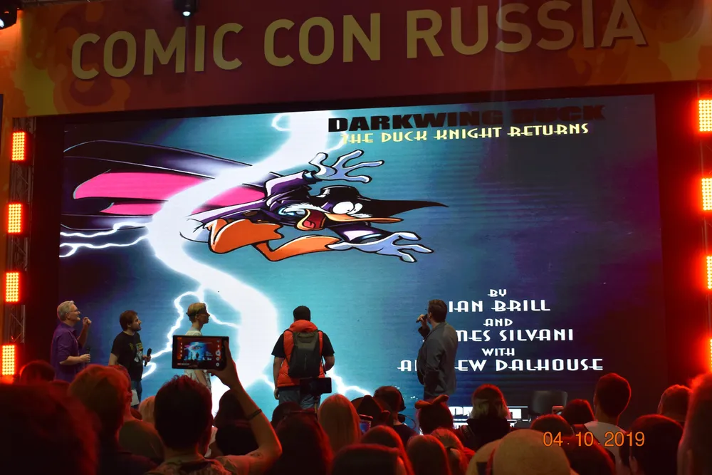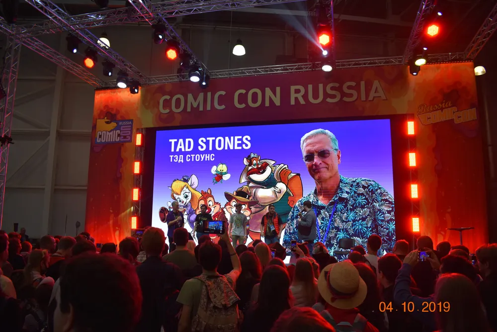 14.45 – поспешил к сцене номер один Comic-Con, где должна была начаться презентация фильма «Кома» - и застал выступление создателя «Чёрного Плаща» Тэда Стоунса.