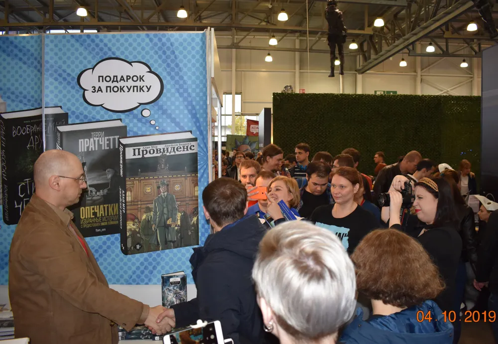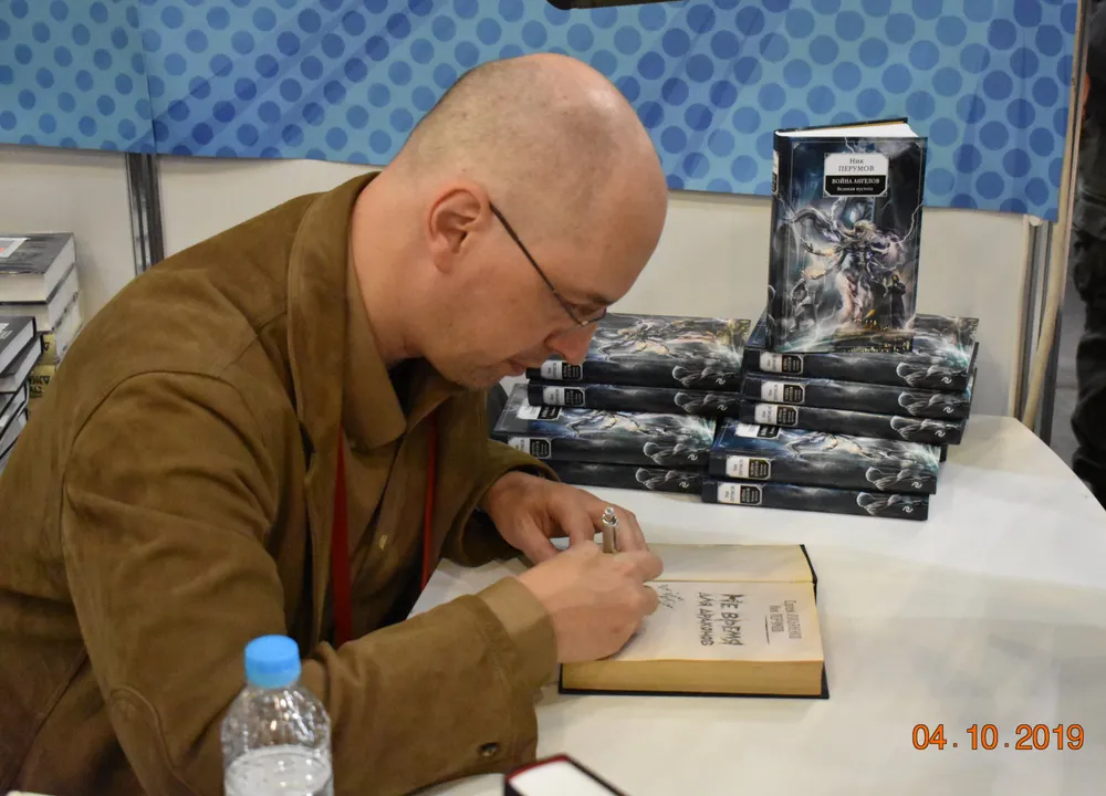 Побежал к книжной точке: и точно, вот он, Ник Перумов, подписывает книги. А у меня в рюкзаке - «Мир Фантастики» с материалом о нём и его книгах, а очередь такая большая, ехать домой так долго…