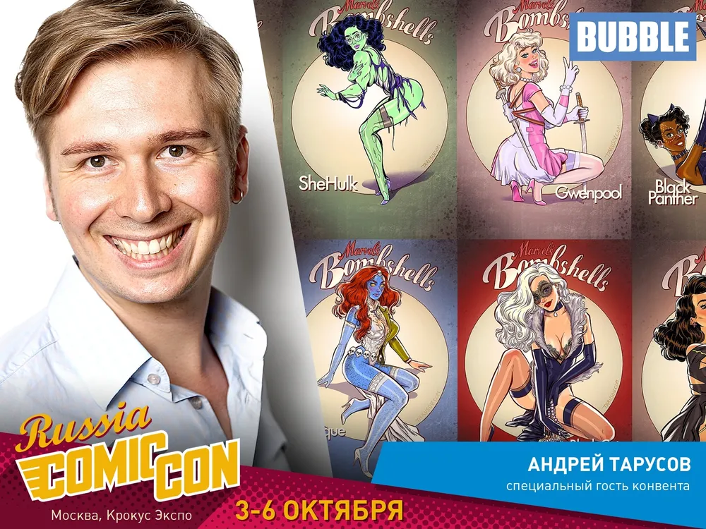 Даже если имя этого гостя вам покажется вам незнакомым, вы все скорее всего видели его работы – тематические пин-ап календари («Olympic Pin-Up», «Осторожно, Крым», «Россия Будущего»), жаркие иллюстрации с персонажами Marvel, Star Wars, Games Of Thrones и многие другие. Сейчас Андрей Тарусов живёт в Лос-Анджелесе, сотрудничает с Disney, 20th Century Fox и другими крупными компаниями.