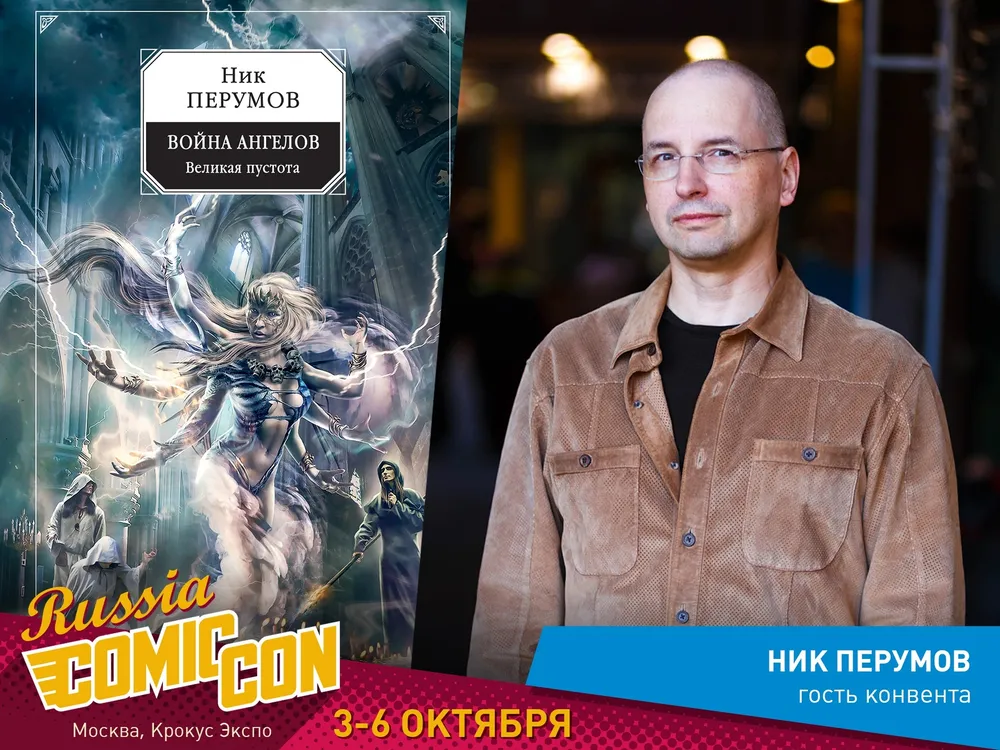 Comic Con Russia почтит своим присутствием популярный российский писатель-фантаст Ник Перумов. В пятницу, 4 октября, он совместно с Кристи Голден проведет панель в кинозале, а в воскресенье, 6 октября, состоится презентация его нового романа «Война ангелов. Великая пустота».