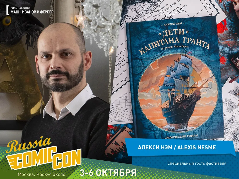 Издательство «Манн, Иванов и Фербер» едет на Comic Con и везет с собой не только комиксы для взрослых и детей на любой возраст и вкус, но и особого гостя – французского комиксиста и иллюстратора Алекси Нэма, известного графической адаптацией романа Жюля Верна «Дети капитана Гранта», где все персонажи нарисованы в виде животных.