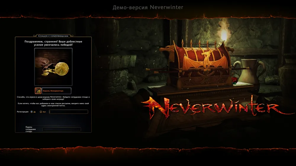 Стенд Neverwinter Online пользовался большой популярностью – еще бы, рекламные плакаты висели даже по дороге к выставке. Заманчивое обещание выдать реальный лут за виртуальные приключения привлекло и меня, так что я (почти) первым делом отправилась туда. Хотите проникнуться атмосферой? Поставьте на повтор какой-нибудь трейлер на полчасика и прибавьте звука. Кажется, я уже «D&D» произношу с такой интонацией оттуда. (Если мне объяснят как перевести в удобоваримый для нашего видеоприложения формат, я обязательно его залью)