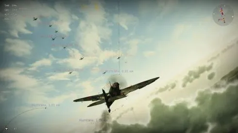 А сражение — это что-то крайне эпичное. Например, нам надо встретить армаду вражеских бомбардировщиков. Их около полусотни летит, и лично нашему звену (сам игрок и несколько пилотов под его командованием) приказано уничтожить где-то пятнадцать. Плюс противника прикрывает дюжина истребителей. В итоге в воздухе творится настоящая мясорубка, все друг за другом гоняются, вдалеке постоянно виднеется пулеметный огонь, парашютисты медленно опускаются вниз, обломки горят на земле. Красиво, эпично, атмосферно.