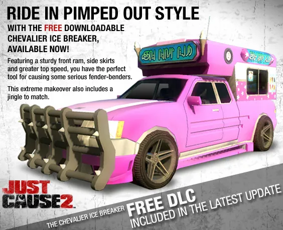 Сегодня было выпущено обновление для Just Cause 2. Игра теперь включает бесплатный 'Развозчик Мороженого', с крепкой передней рамой, боковыми юбками и большой максимальной скоростью. С помощью этого грузовика мороженого, у вас есть прекрасный шанс для причинения серьезного вреда.